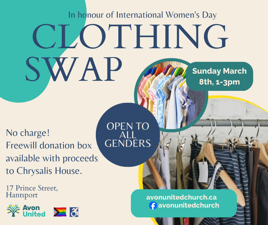 If you have gently used clothing to donate, drop it off at Avon United Church on Thursdays between 1 – 5:00pm or Sunday mornings between 11:30am-12:30pm
